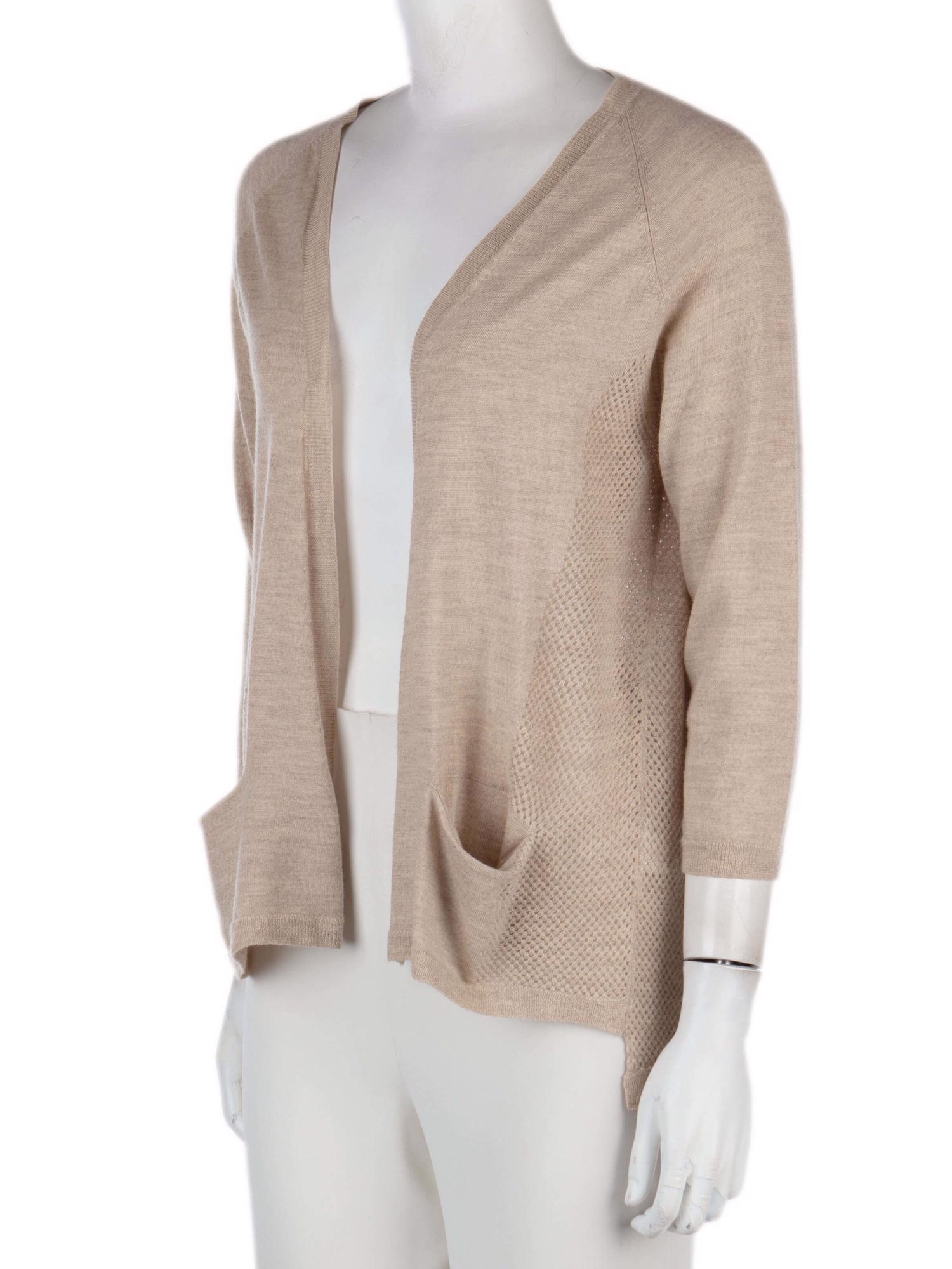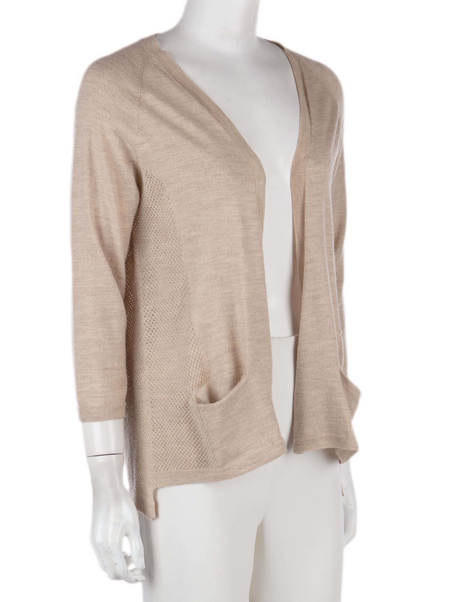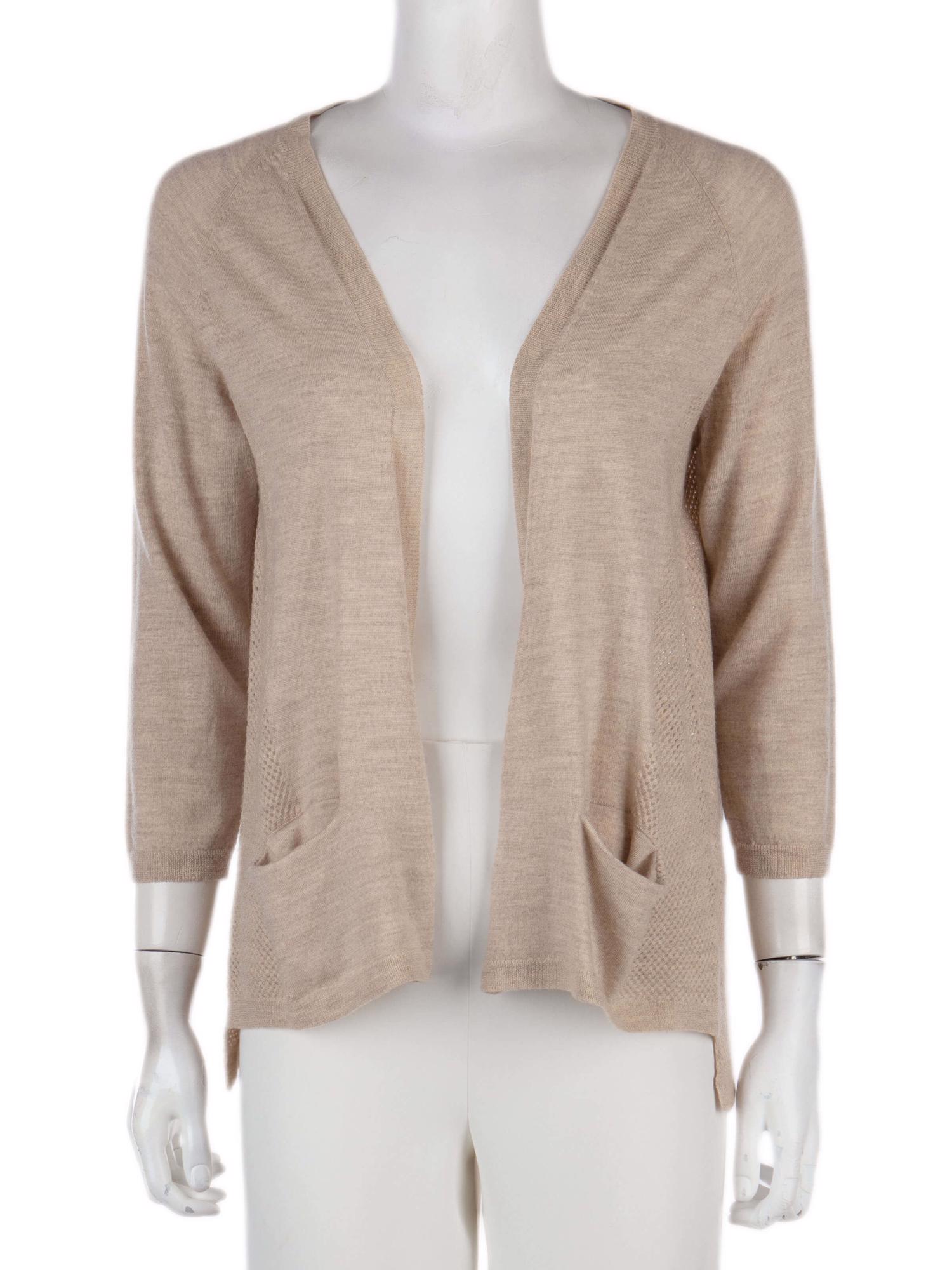• Önü açık giyilen, yandan cepli, sırtı delikli, 3/4 kollu hırka