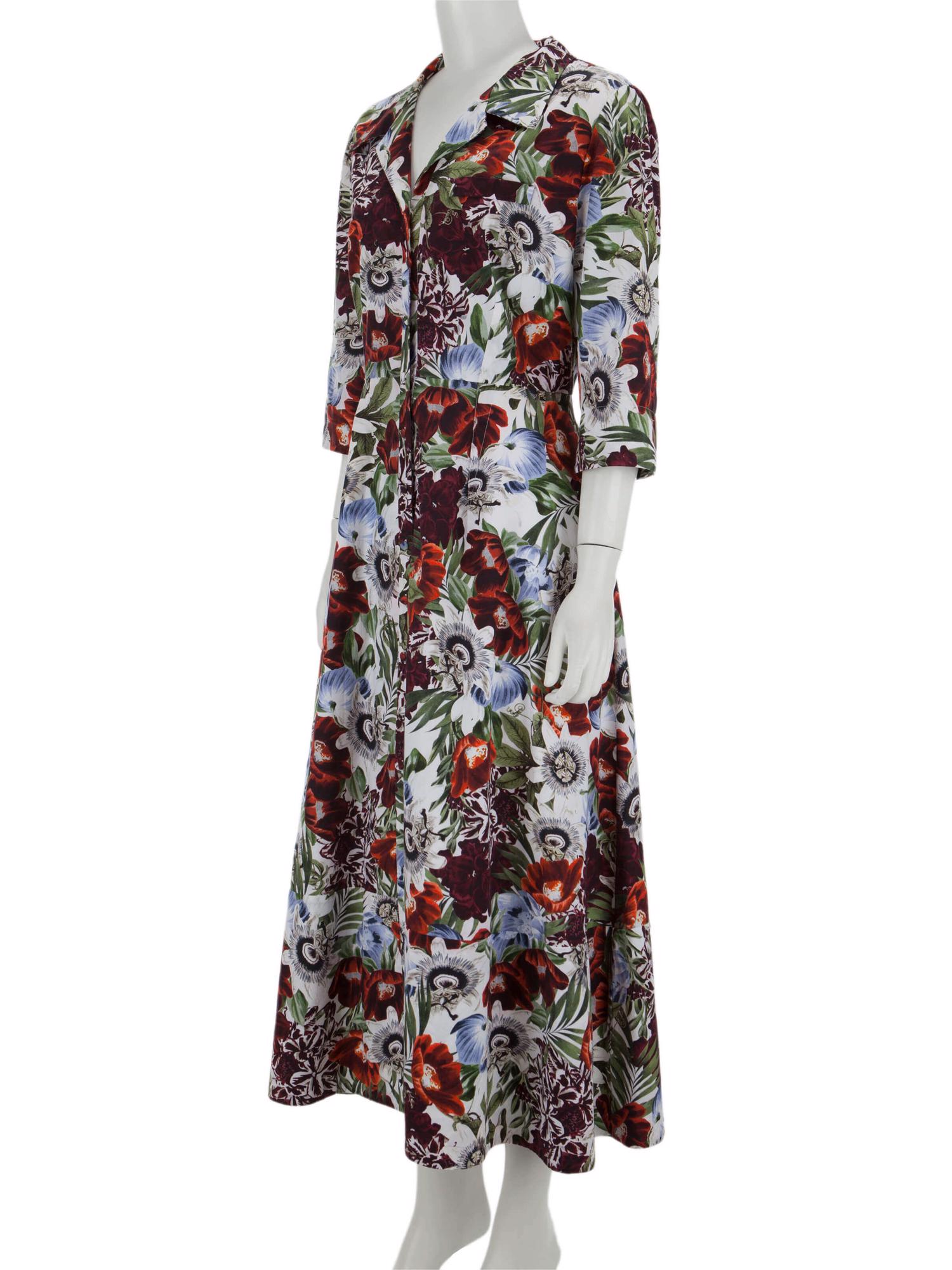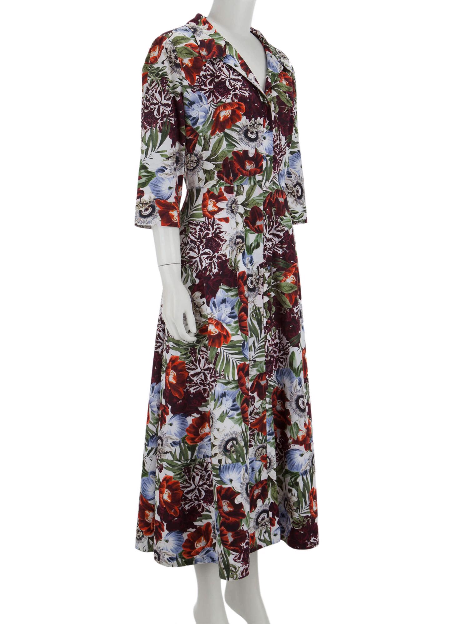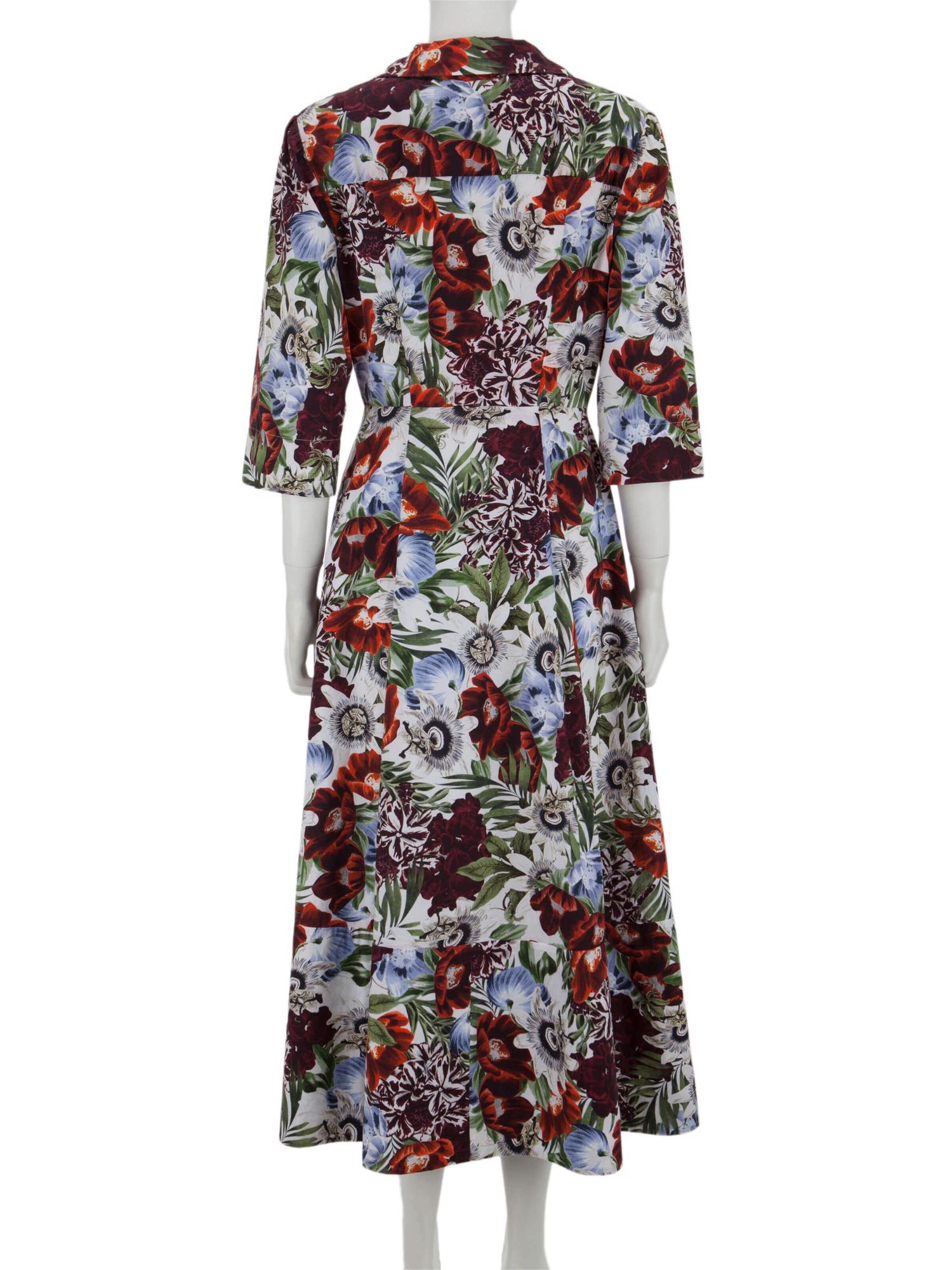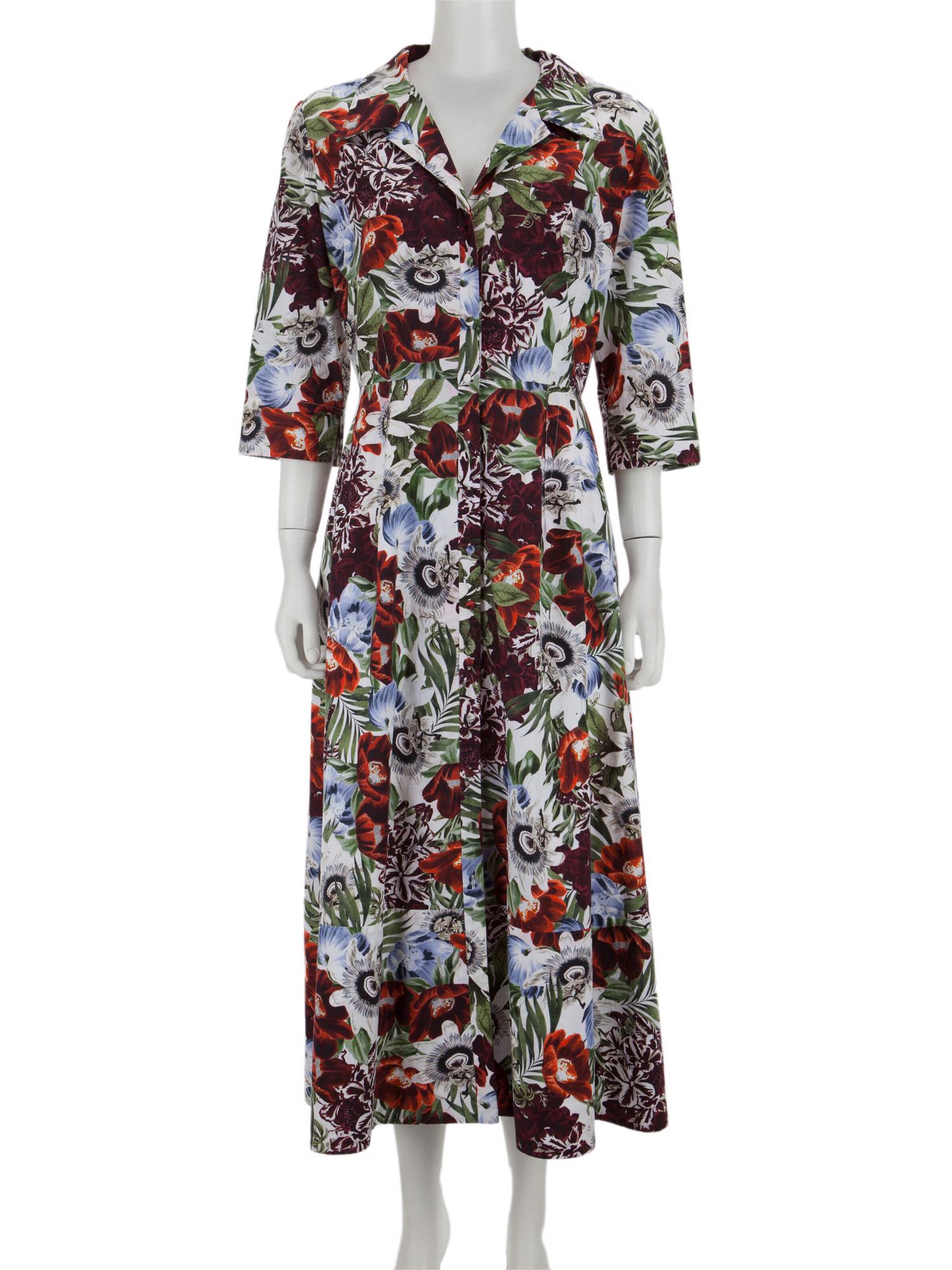 • Önden düğmeli, yarım kollu, yandan gizli cepli, çiçek desenli, kabarık etekli, uzun elbise