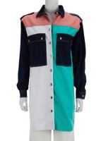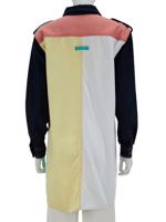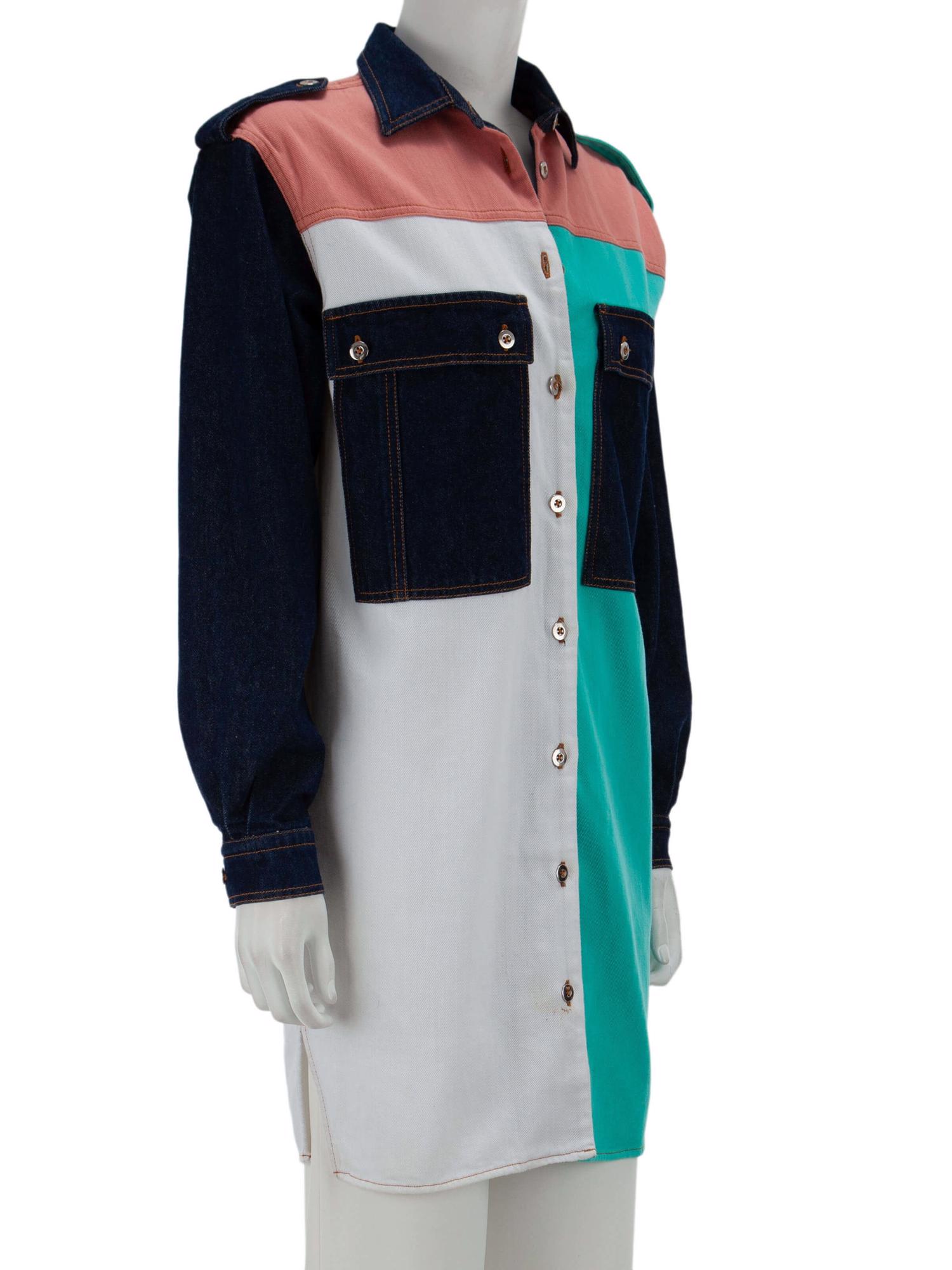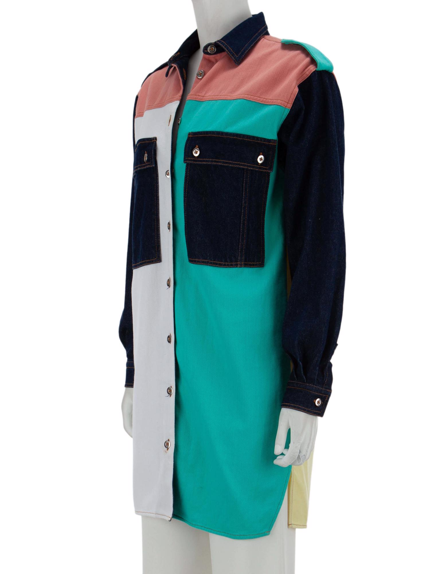 • Önden düğmeli, uzun kollu, kapaklı cepli, farklı renkli kumaşlardan yapılmış, uzun jean ceket