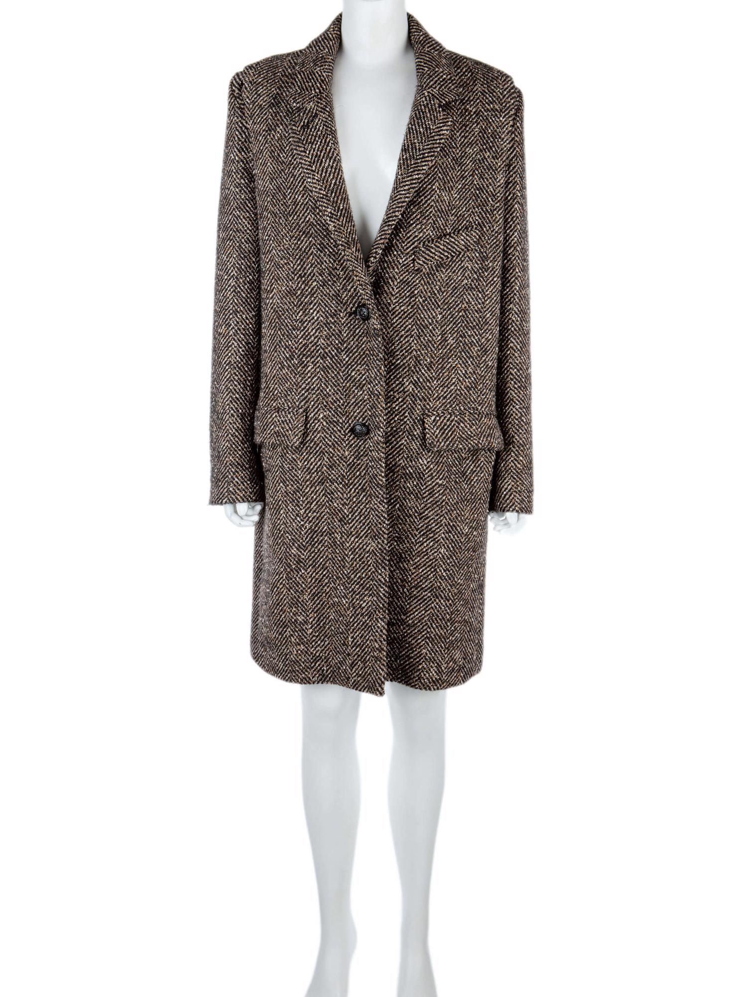 • Önden logo düğmeli, uzun kollu, kapaklı cepli, arkası yırtmaçlı, logo astarlı, balık sırtı desenli palto