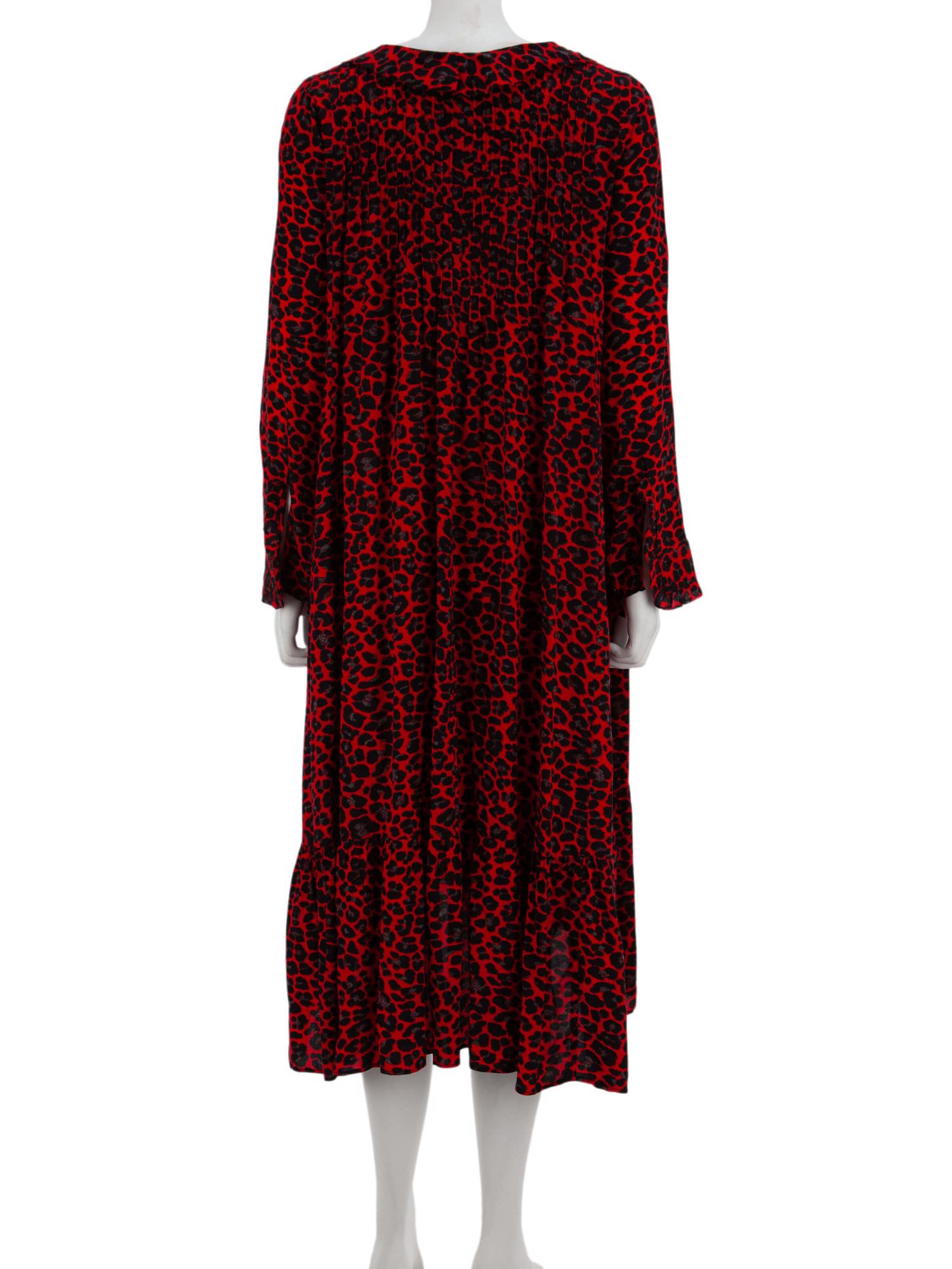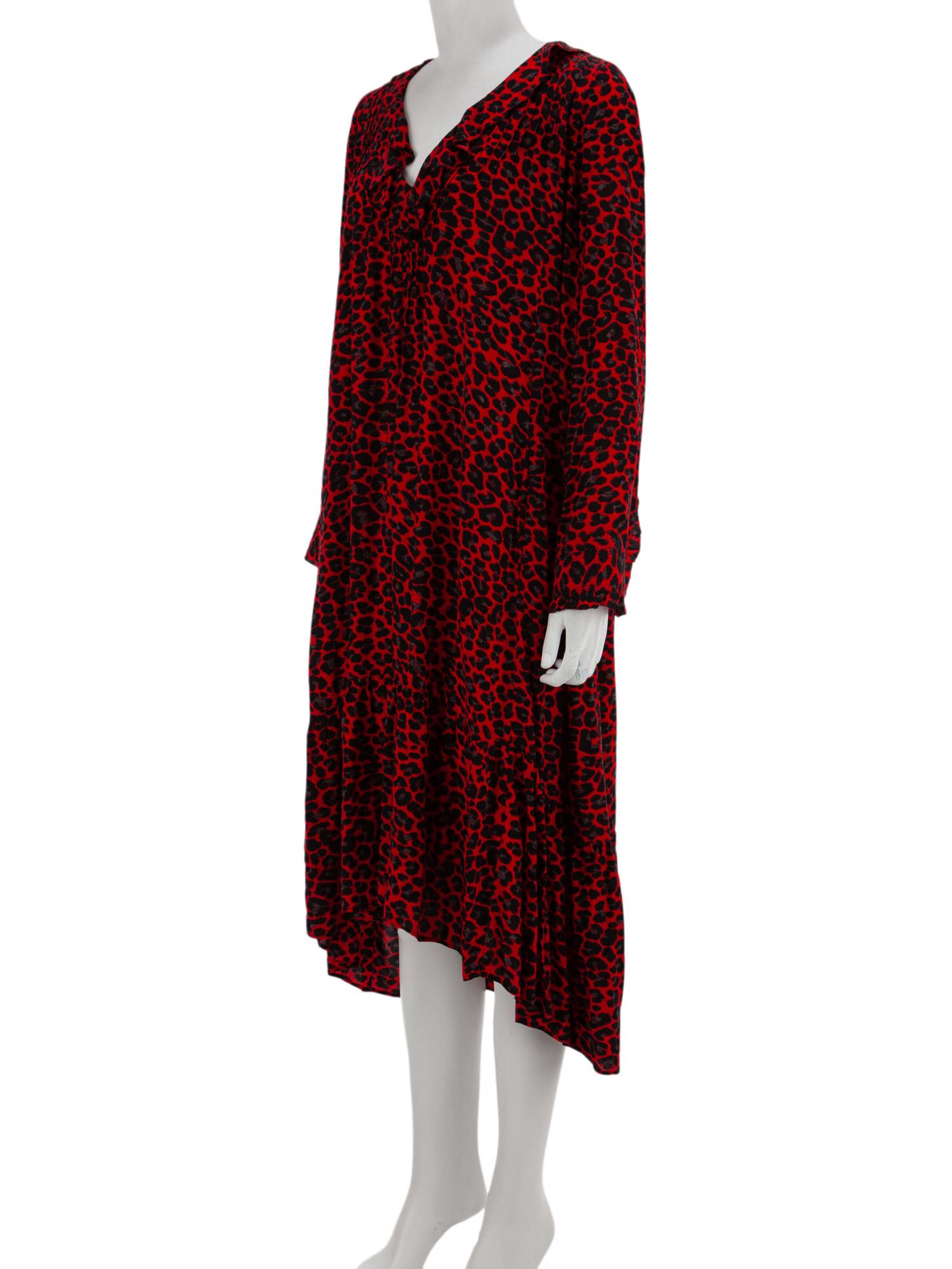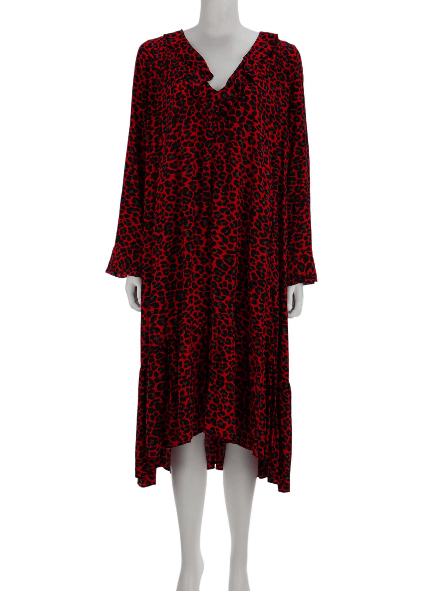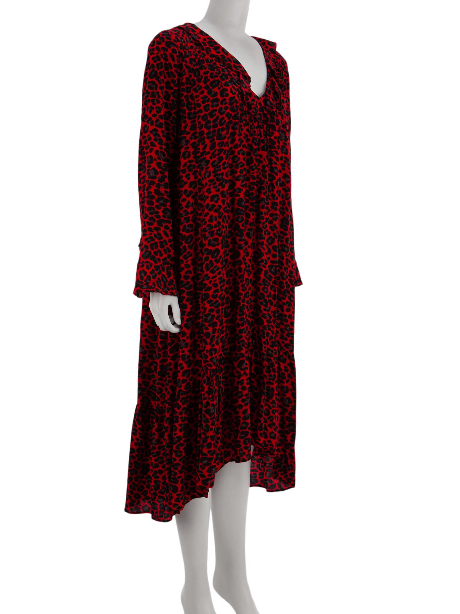 • V yakalı, uzun kollu, yakası mini volanlı, leopar desenli, yanlarda cepleri bulunan, asimetrik kesim, diz altı elbise