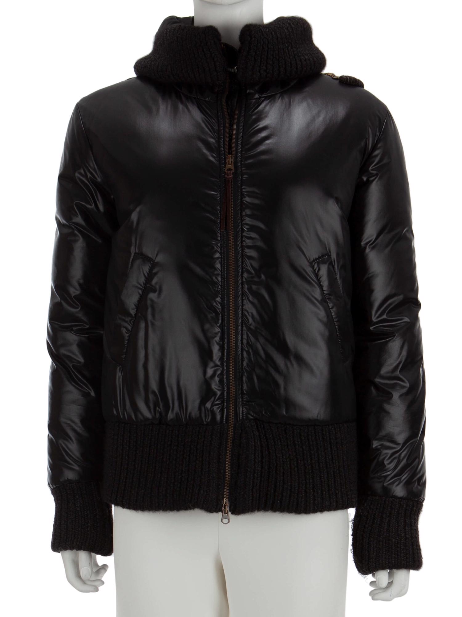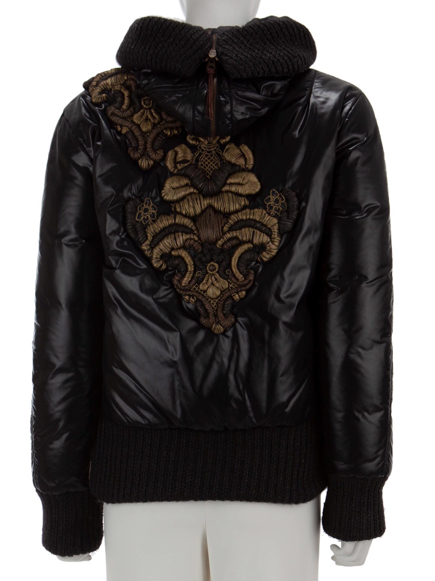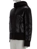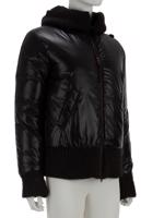 • Önden fermuarlı, uzun kollu, yakası, manşetleri ve etek uçları triko, sırtı işlemeli, kapüşonlu, kaz tüyü mont