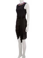 • Yandan ve arkadan fermuarlı, yakası renkli boncuk işlemeli, kolsuz, büzgülü etekli, astarlı, diz üstü elbise