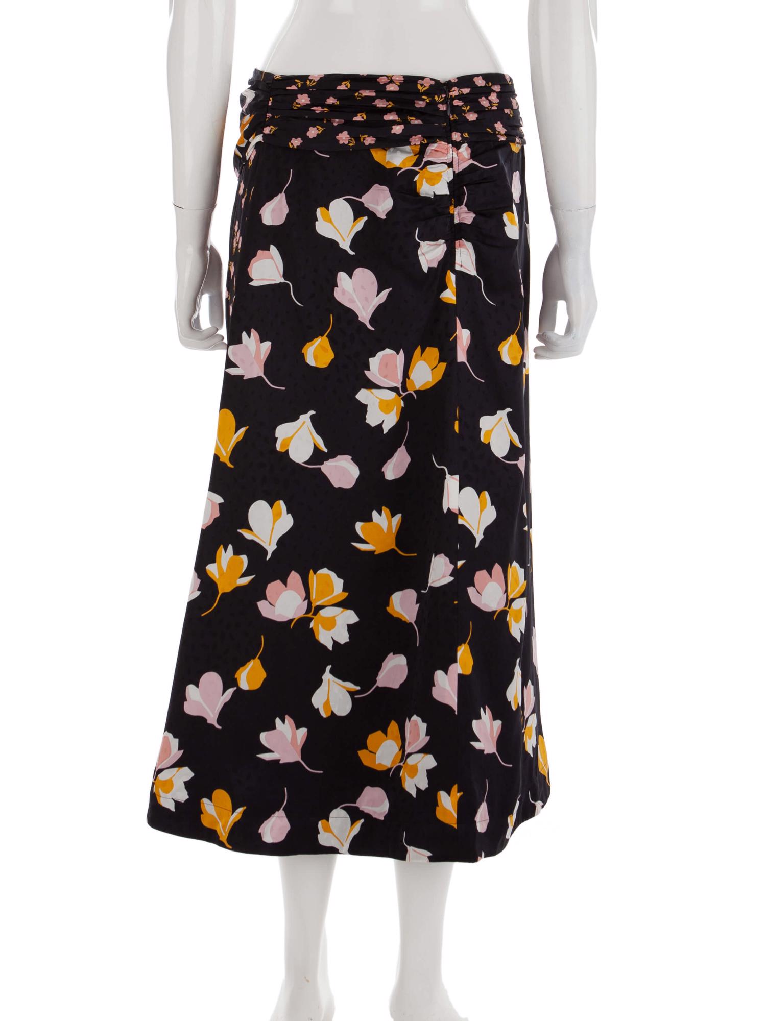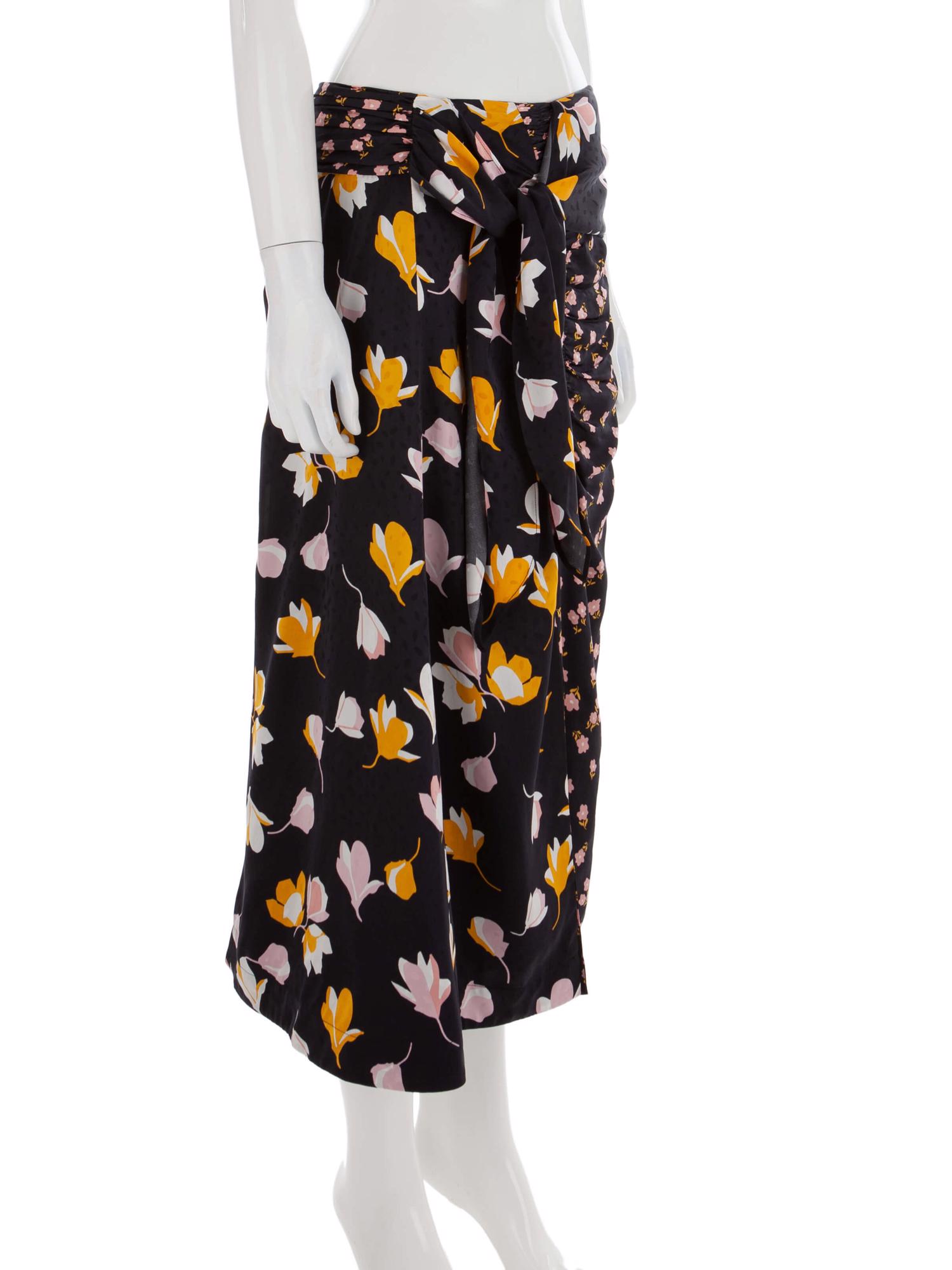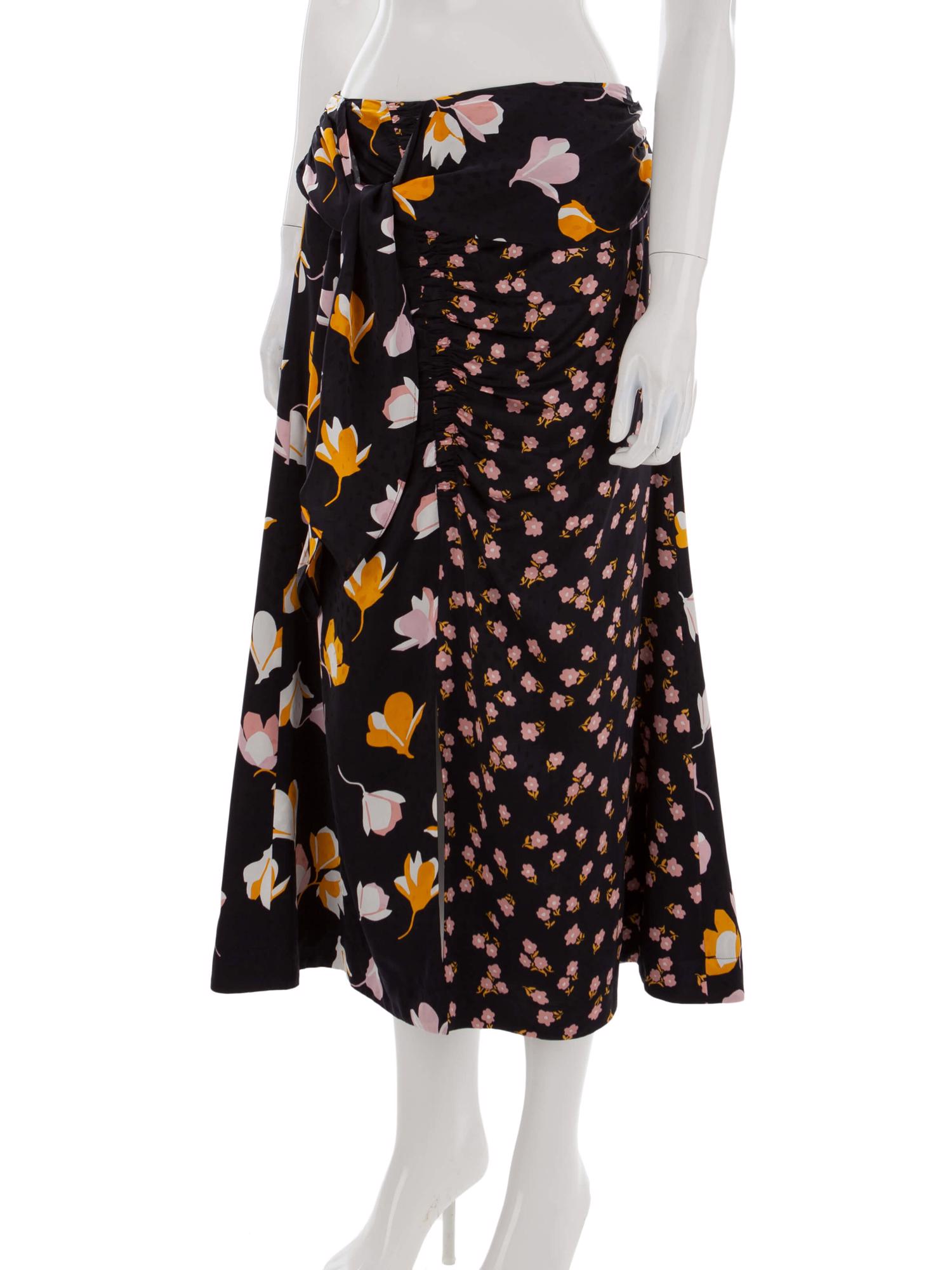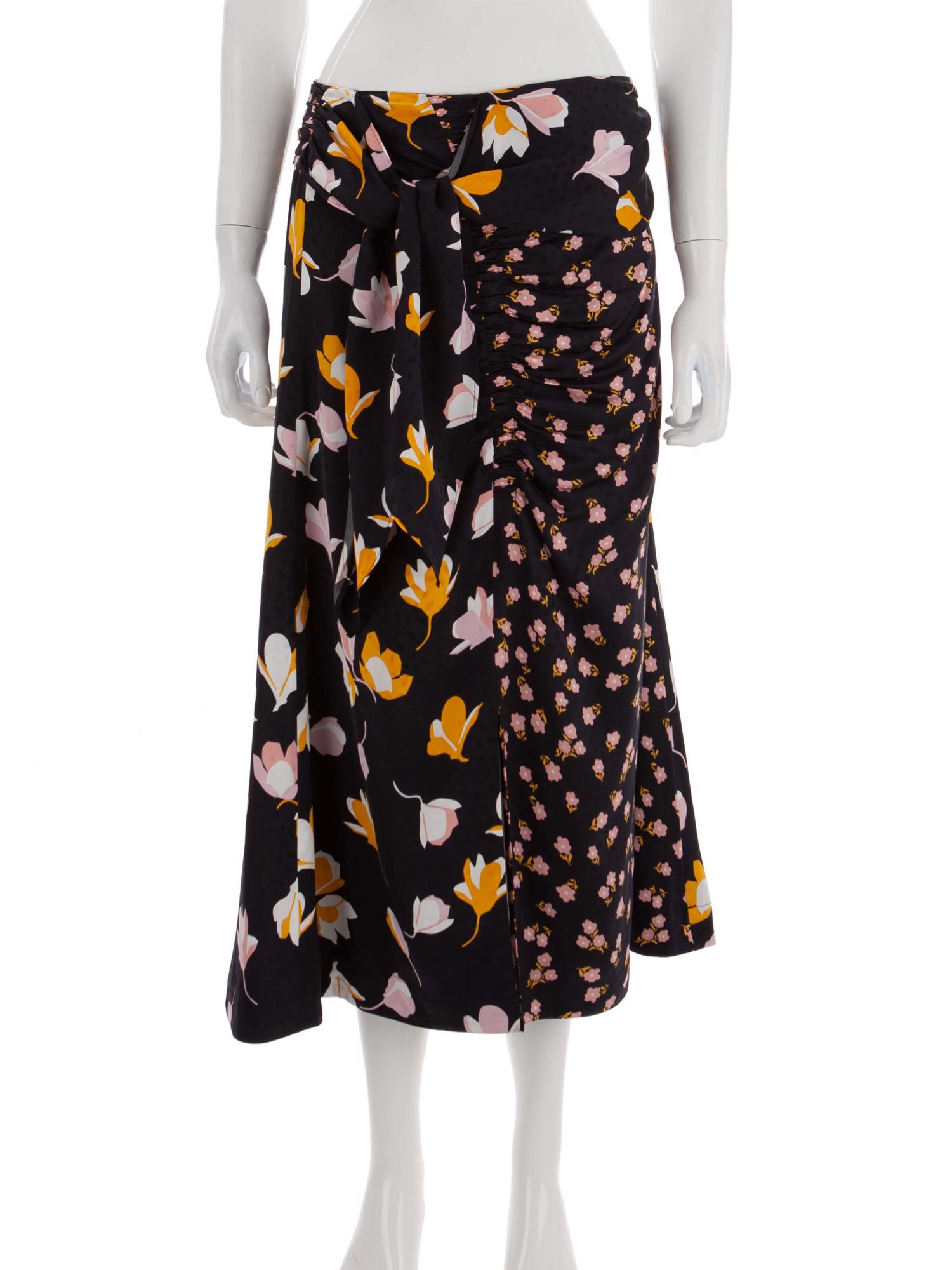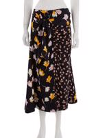 • Arkadan fermuarlı, iki farklı desende kumaştan dikilmiş, belden bağlamalı, diz altı etek