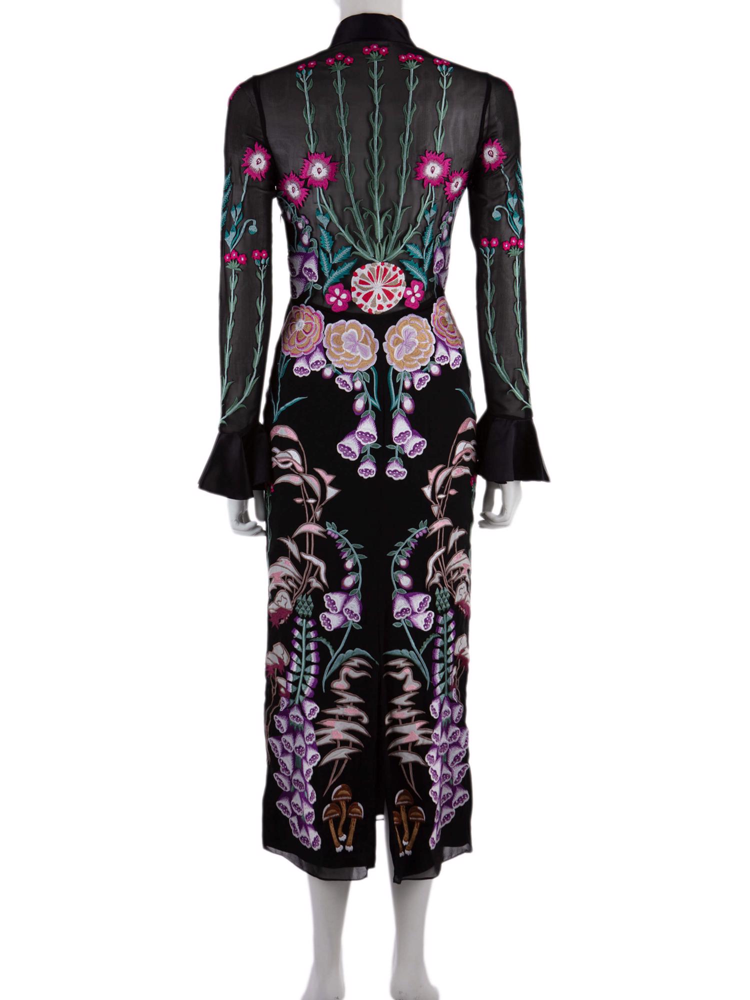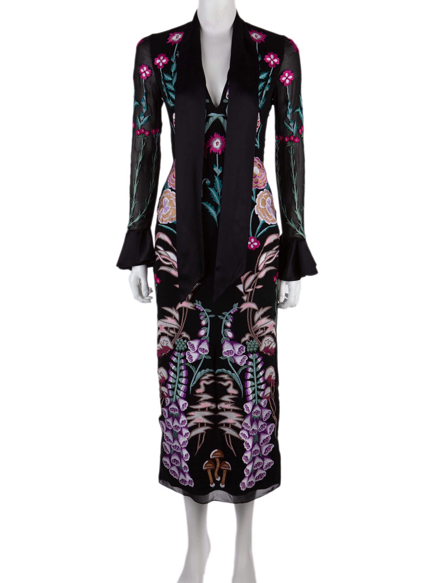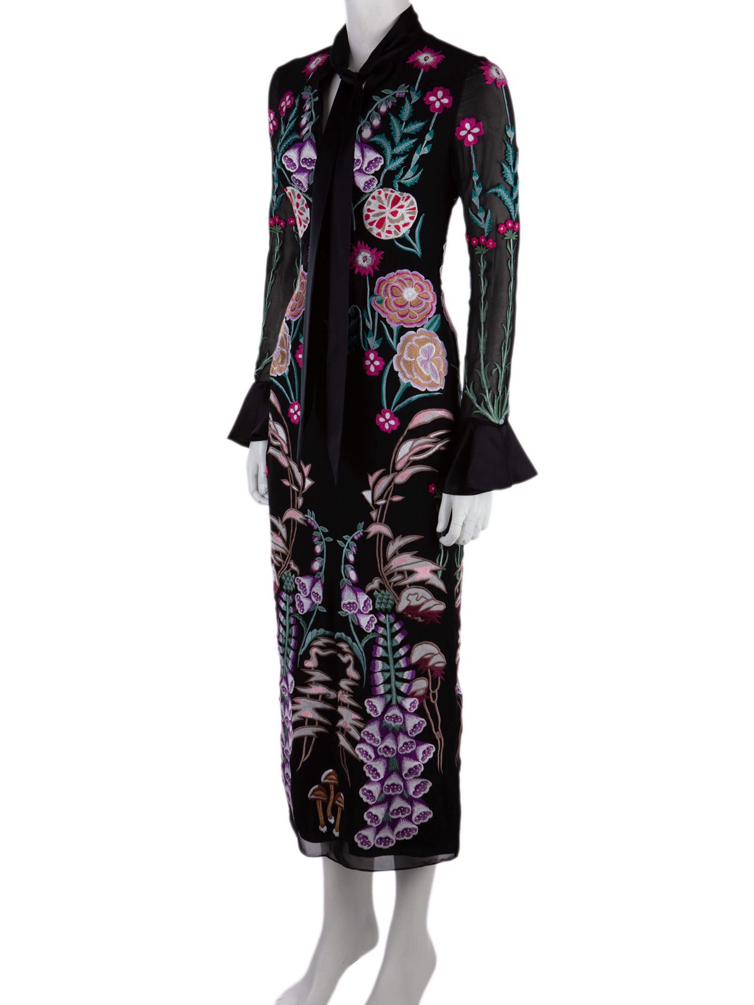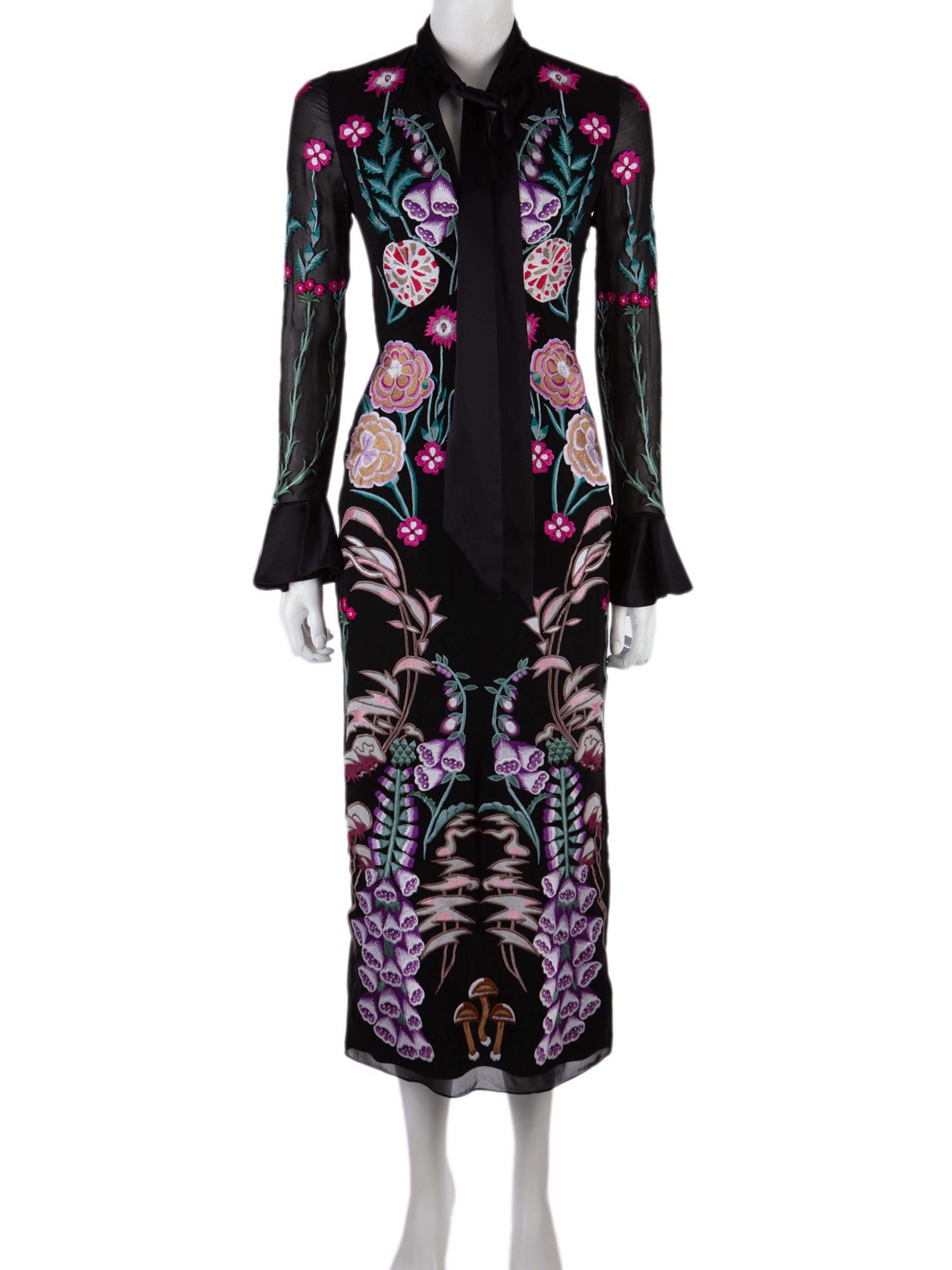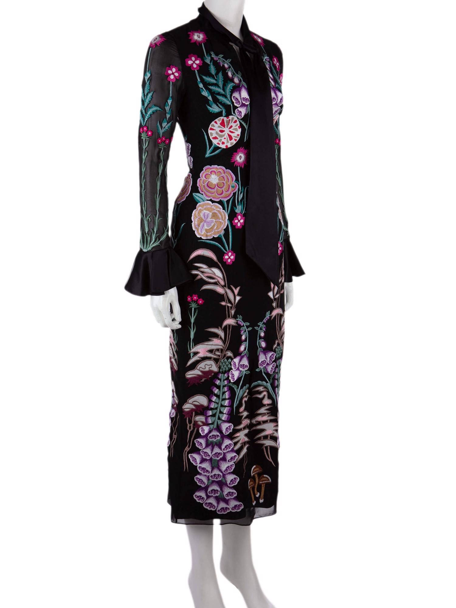 • Yandan fermuarlı, V yakalı, yakası kuşaklı, uzun volanlı kollu, kolları ve sırtı transparan, astarlı, çiçek işlemeli, uzun elbise