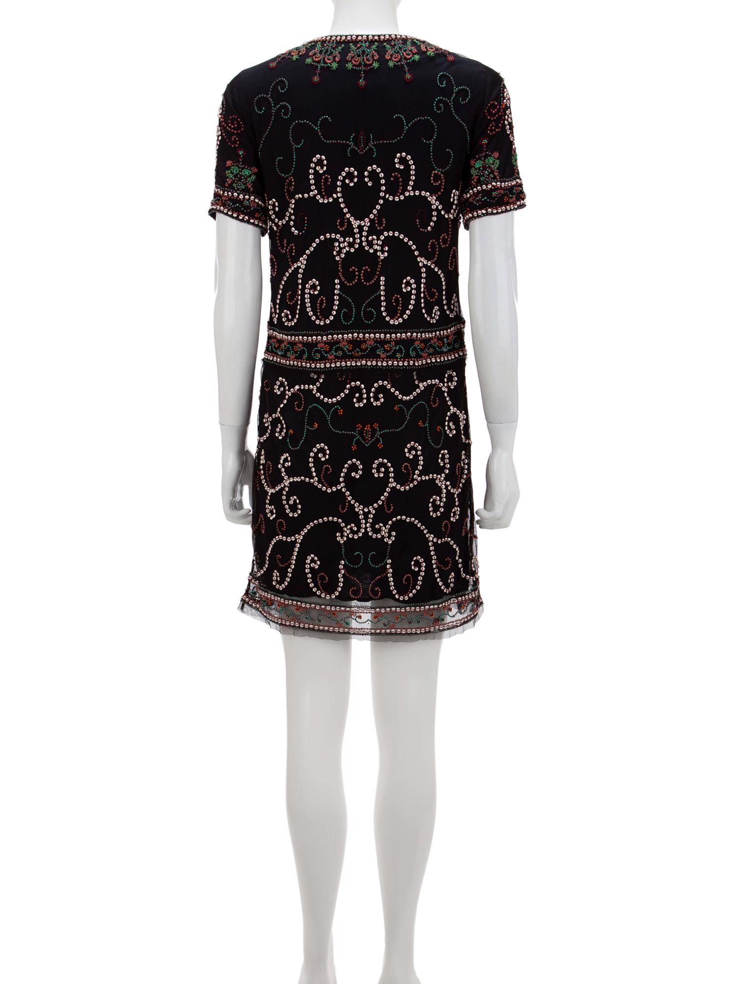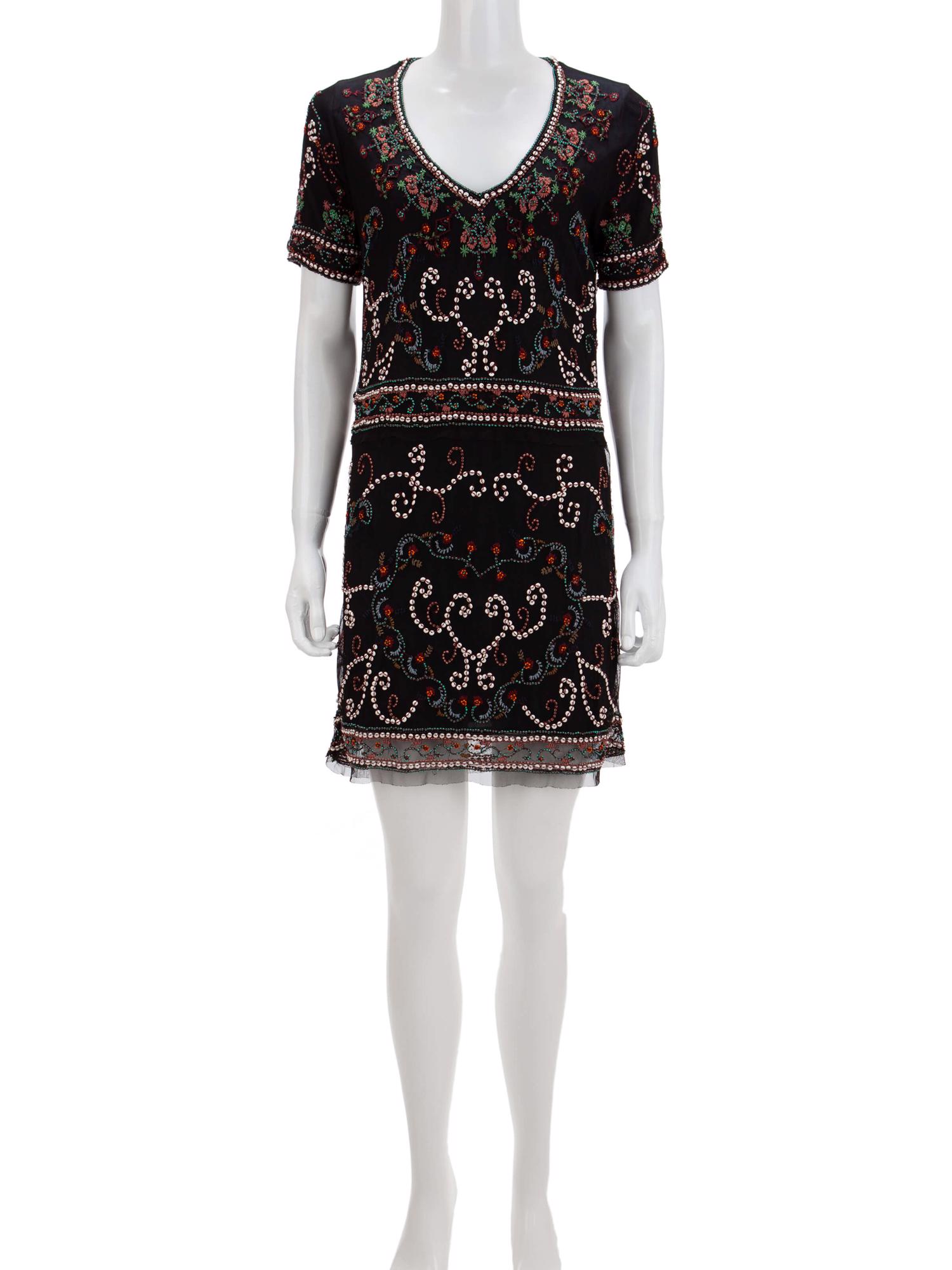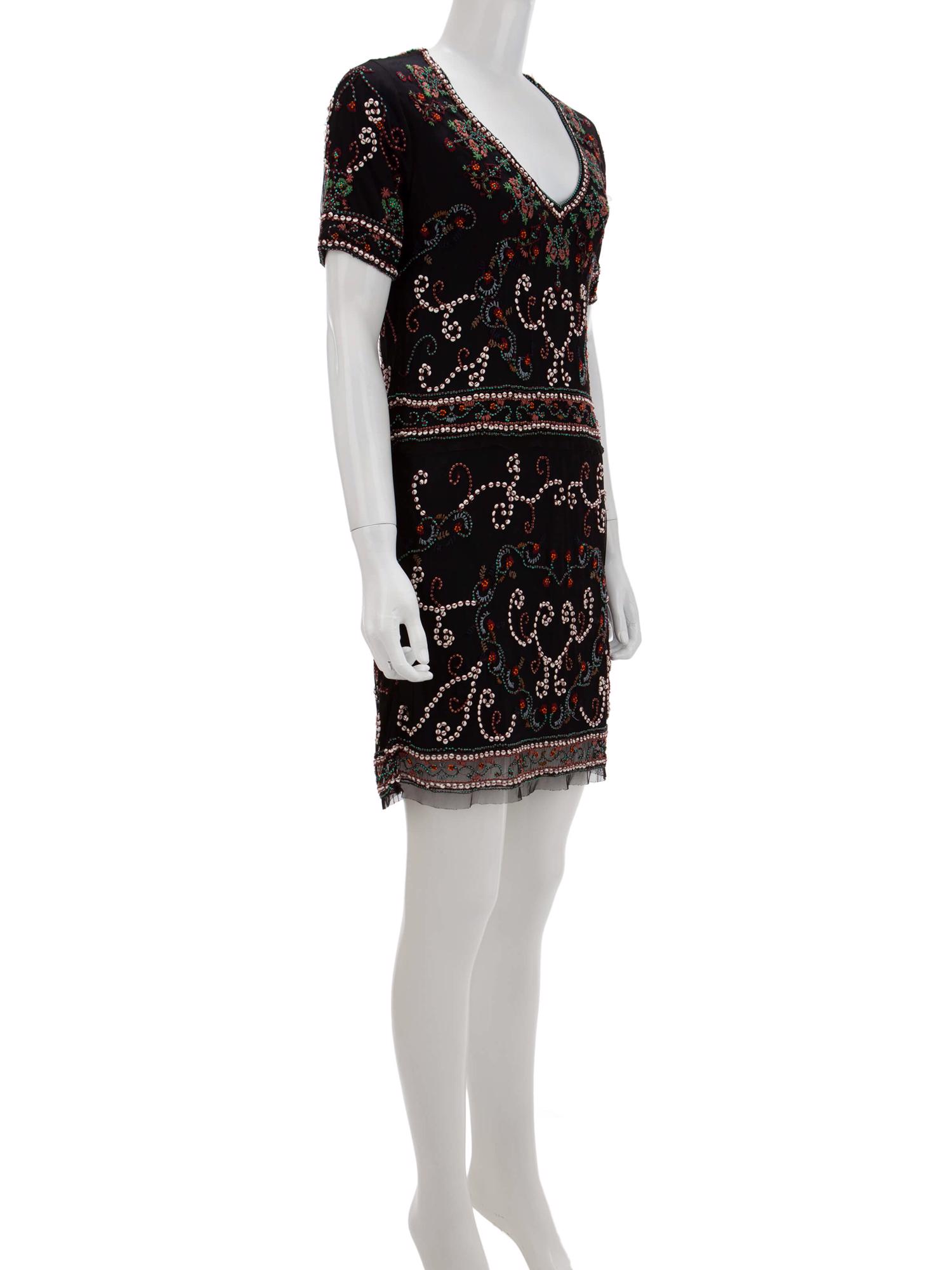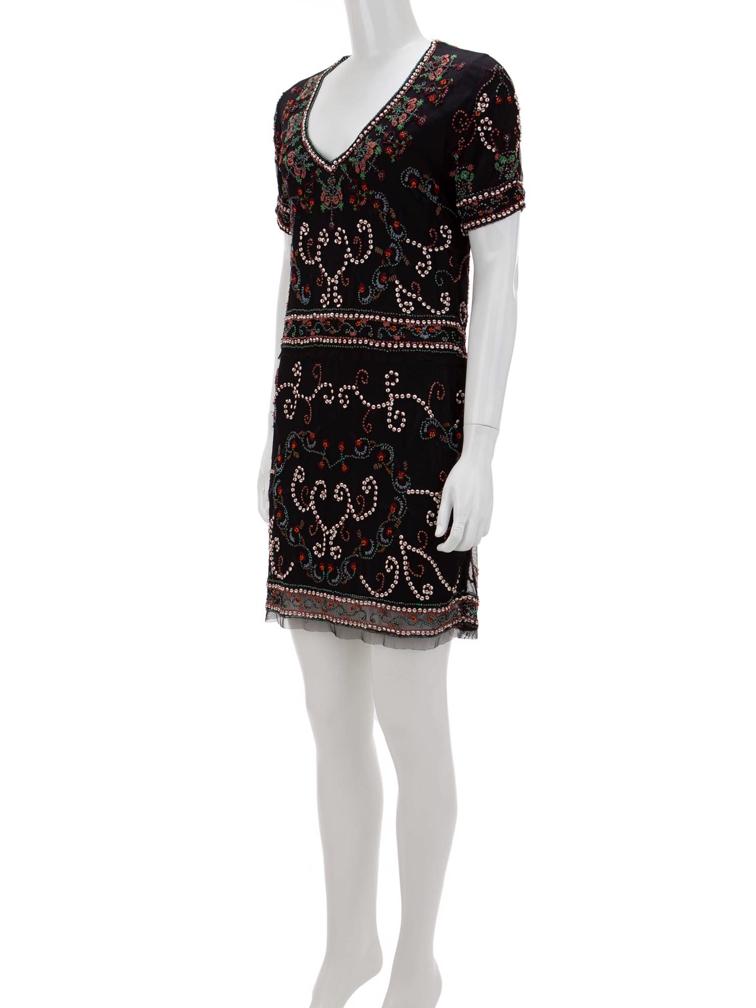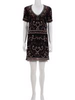 • V yakalı, kısa kollu, boncuk işlemeli, etek uçları tüllü, mini elbise