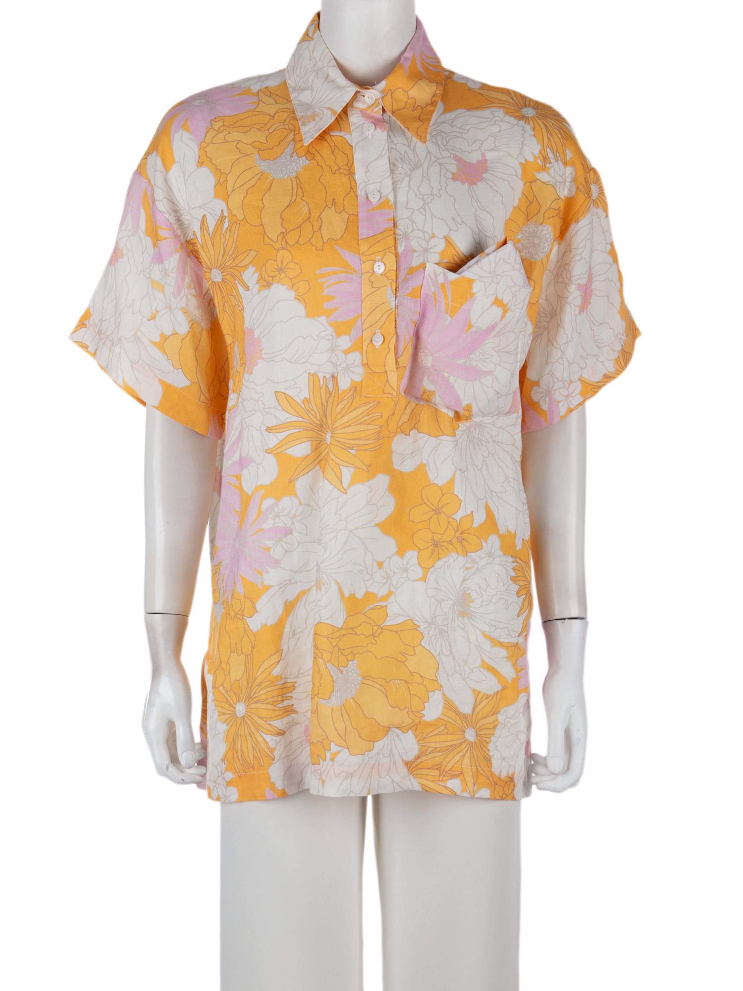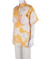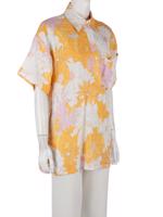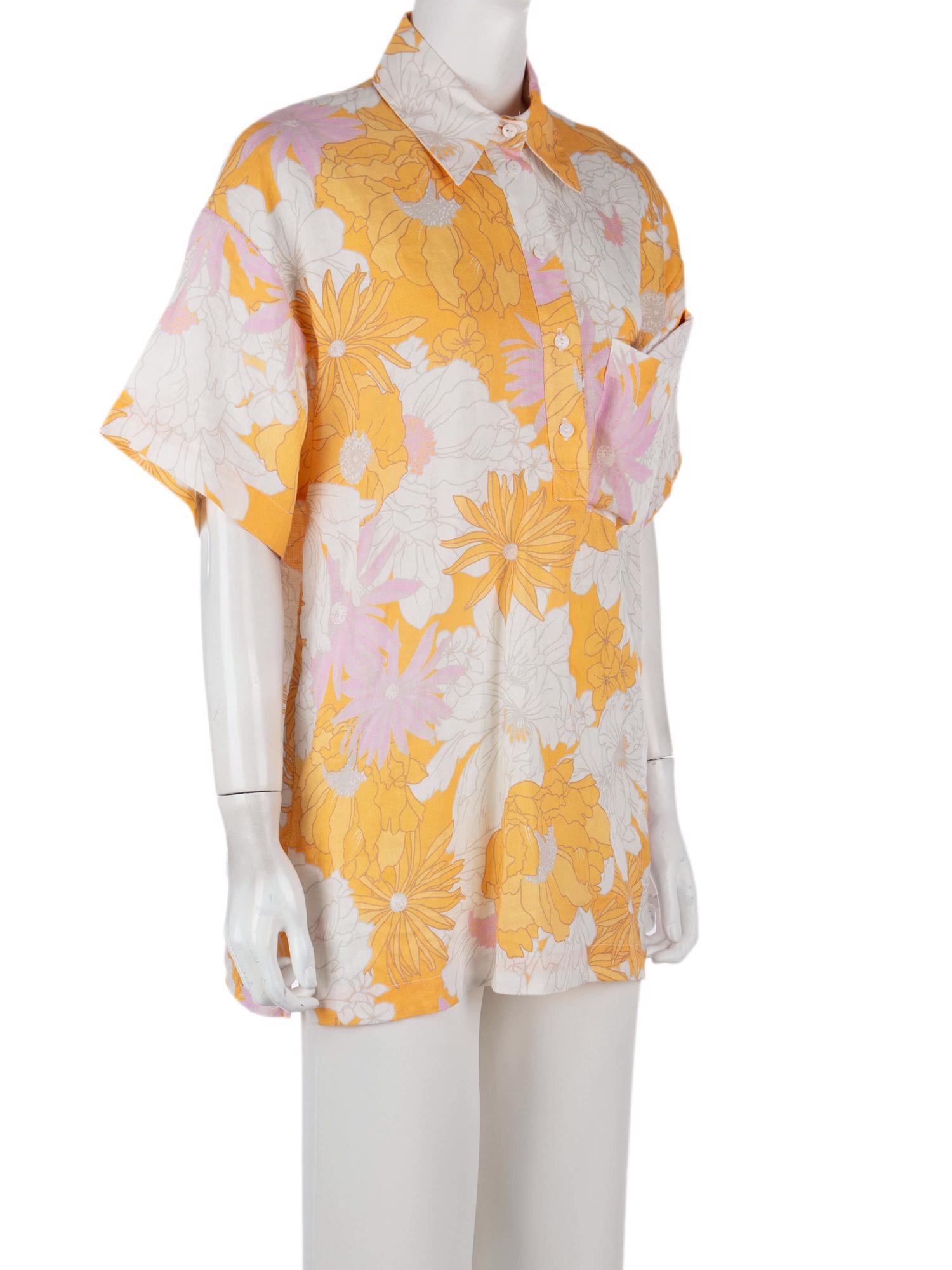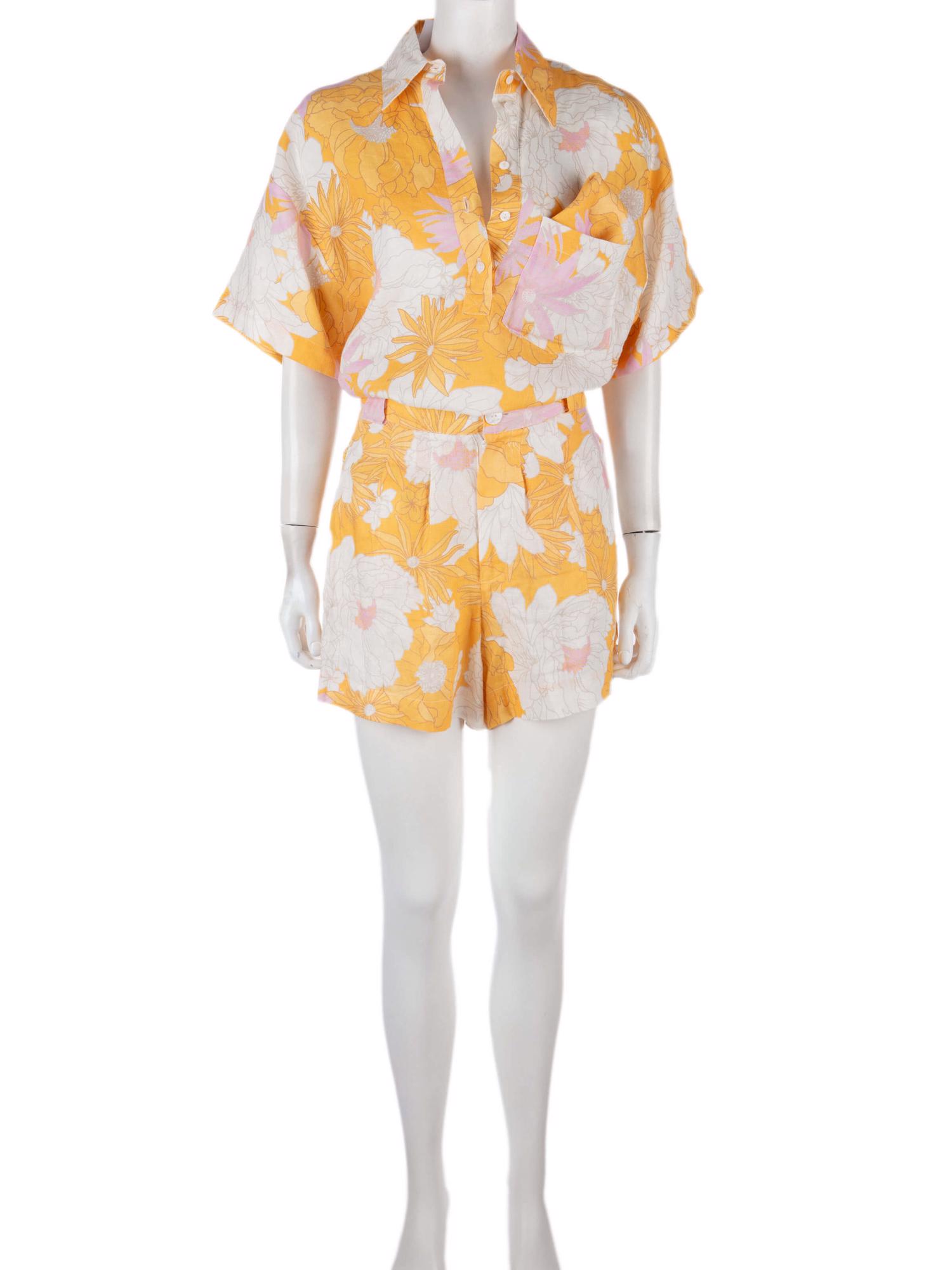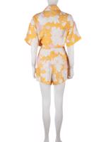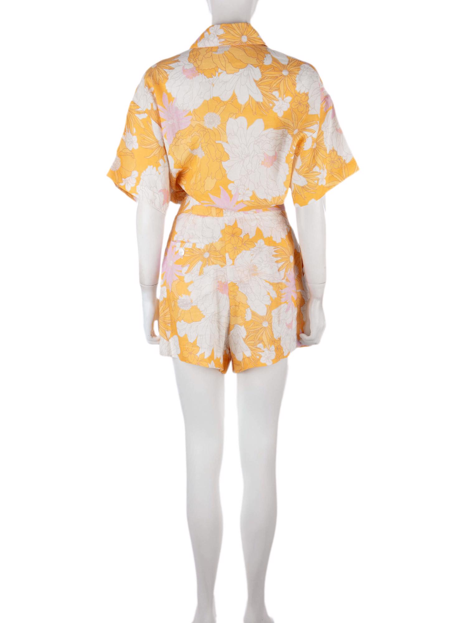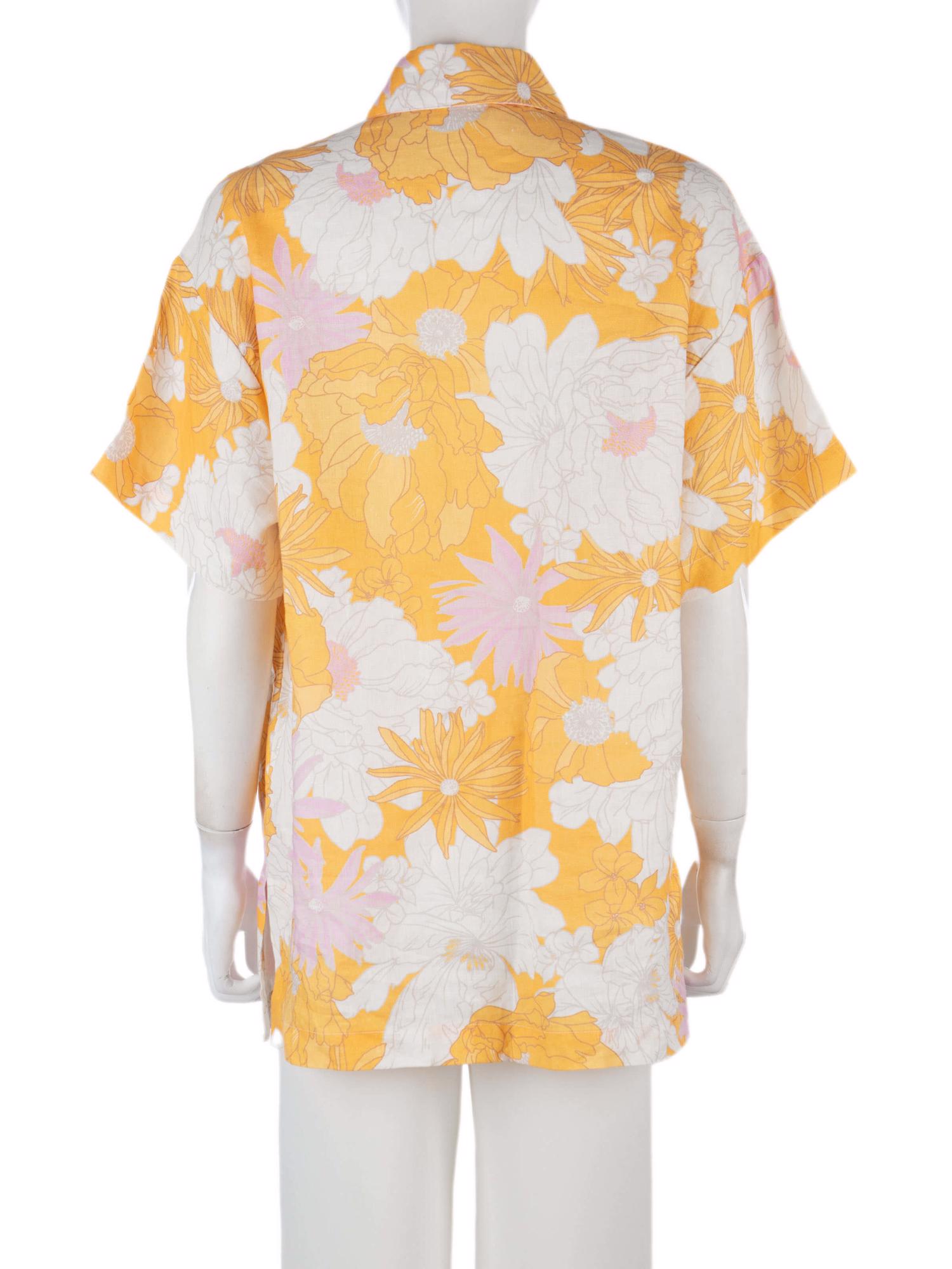 • Önden yarım düğmeli, mendil aksesuarlı göğüs cebi olan, kısa kollu, çiçek desenli bluz. Takım şortu da listelerimizde (35932)