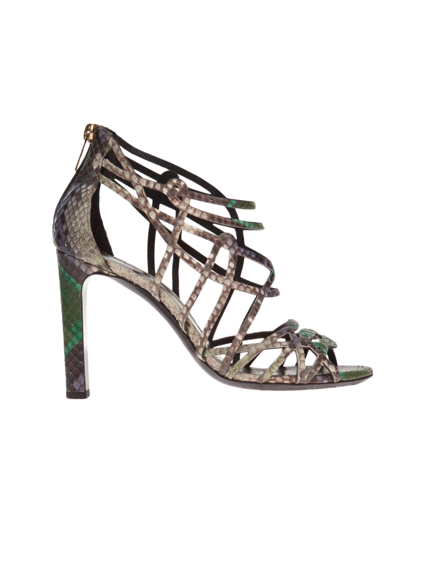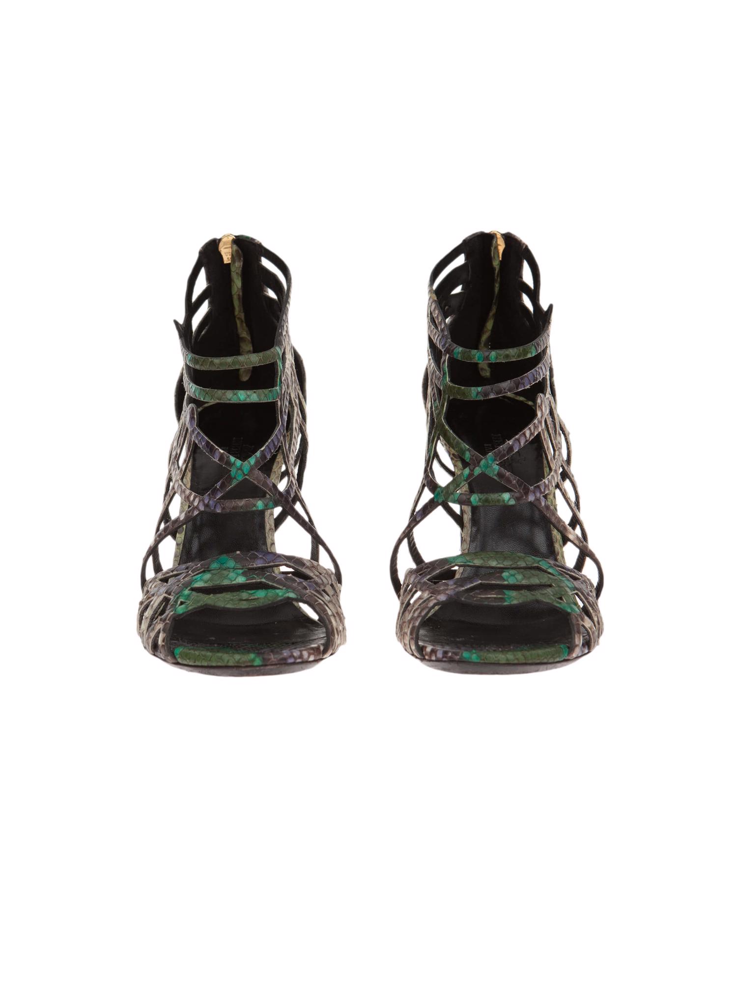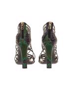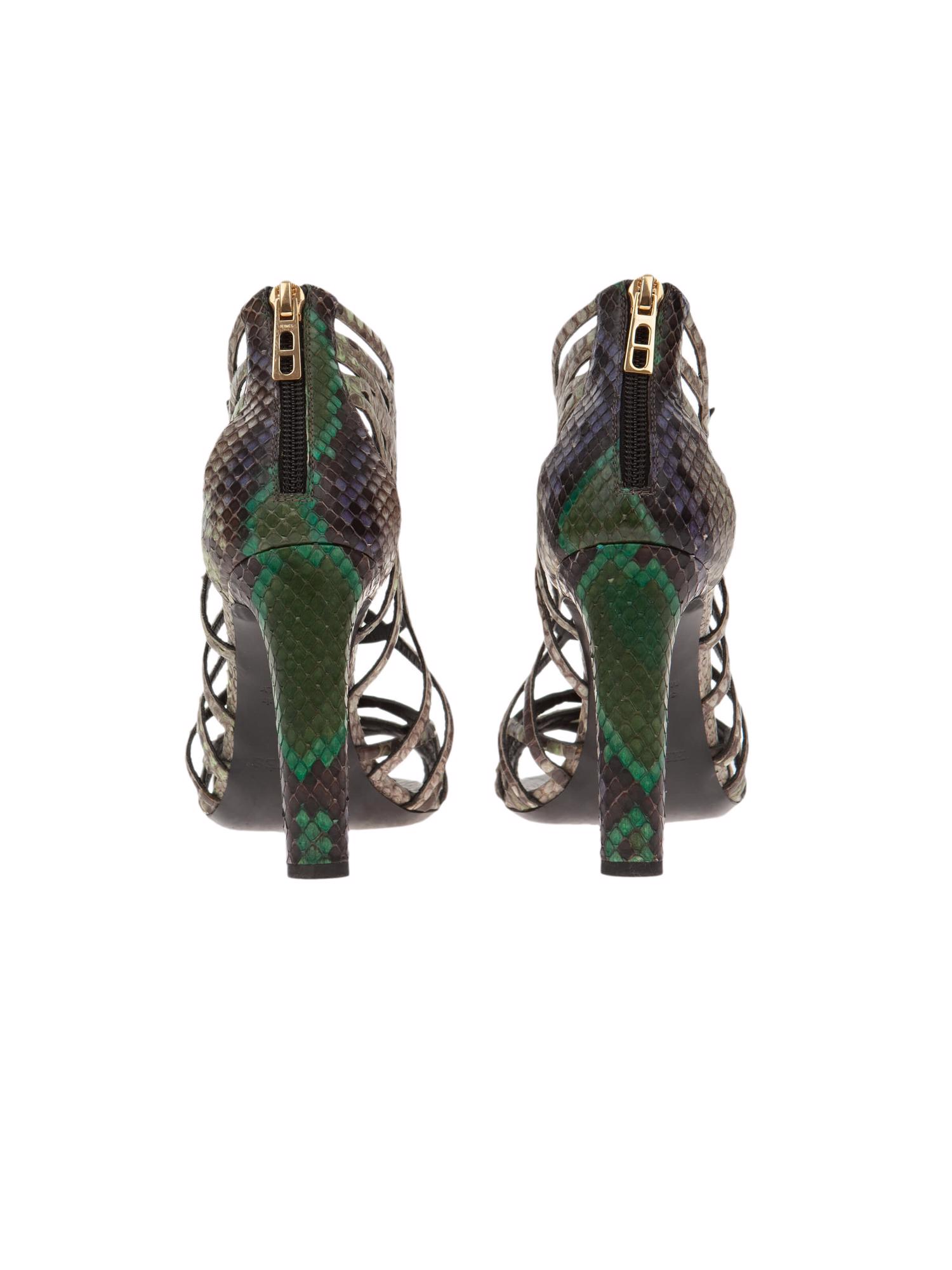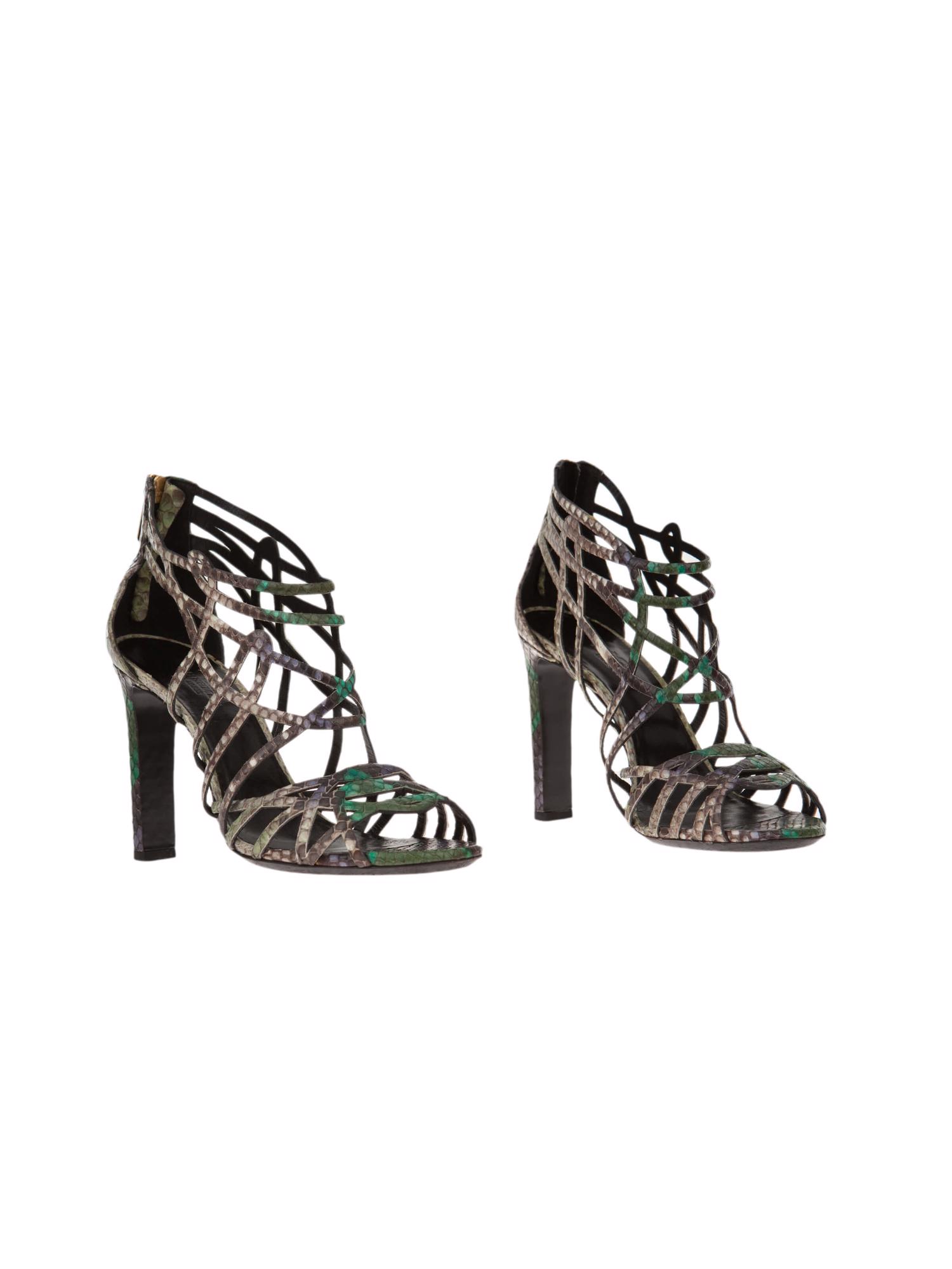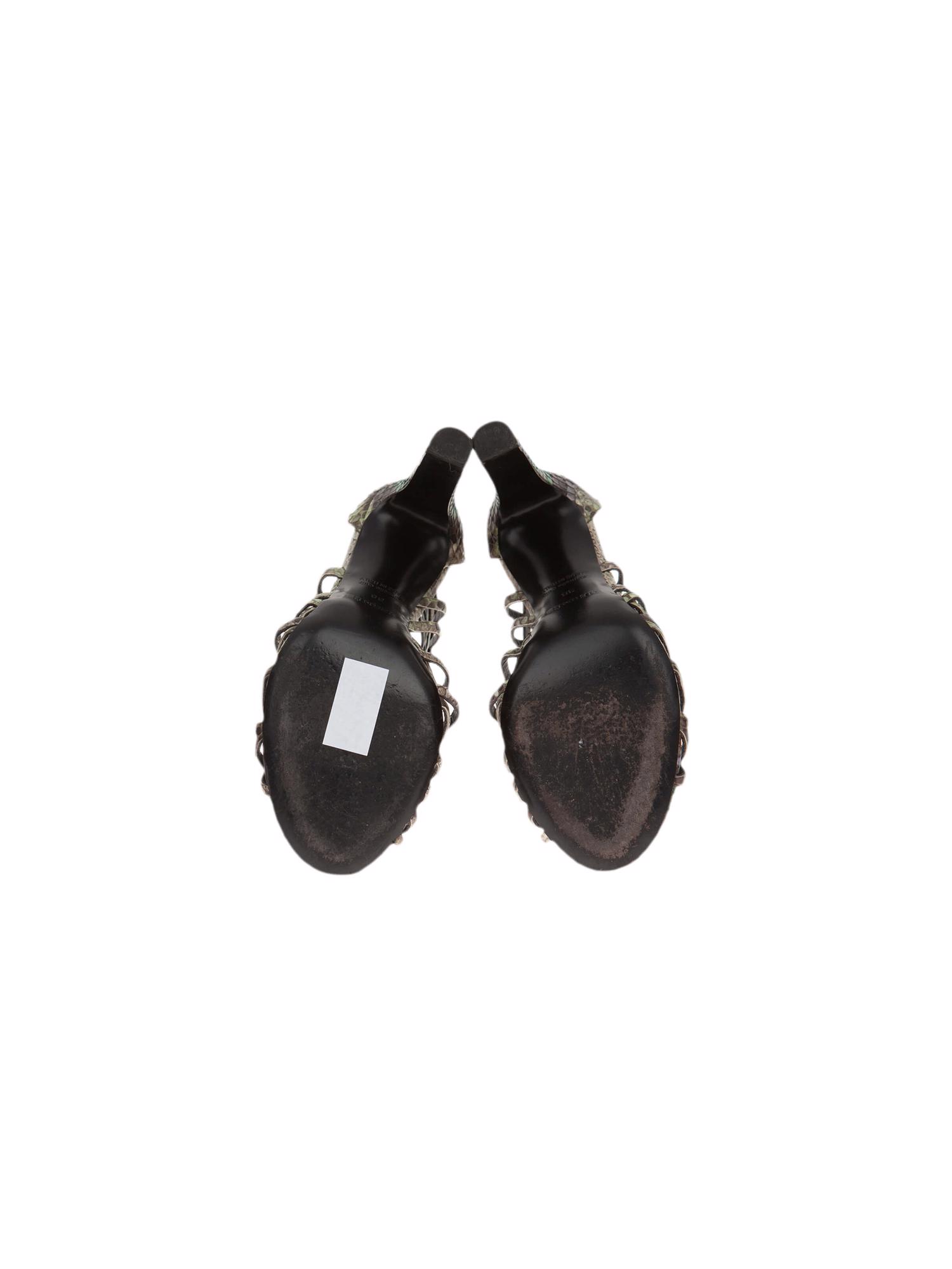 • İnce bantlardan oluşan, arkadan fermuarlı, altın rengi metal logo aksesuarlı, kalın topuklu ayakkabı